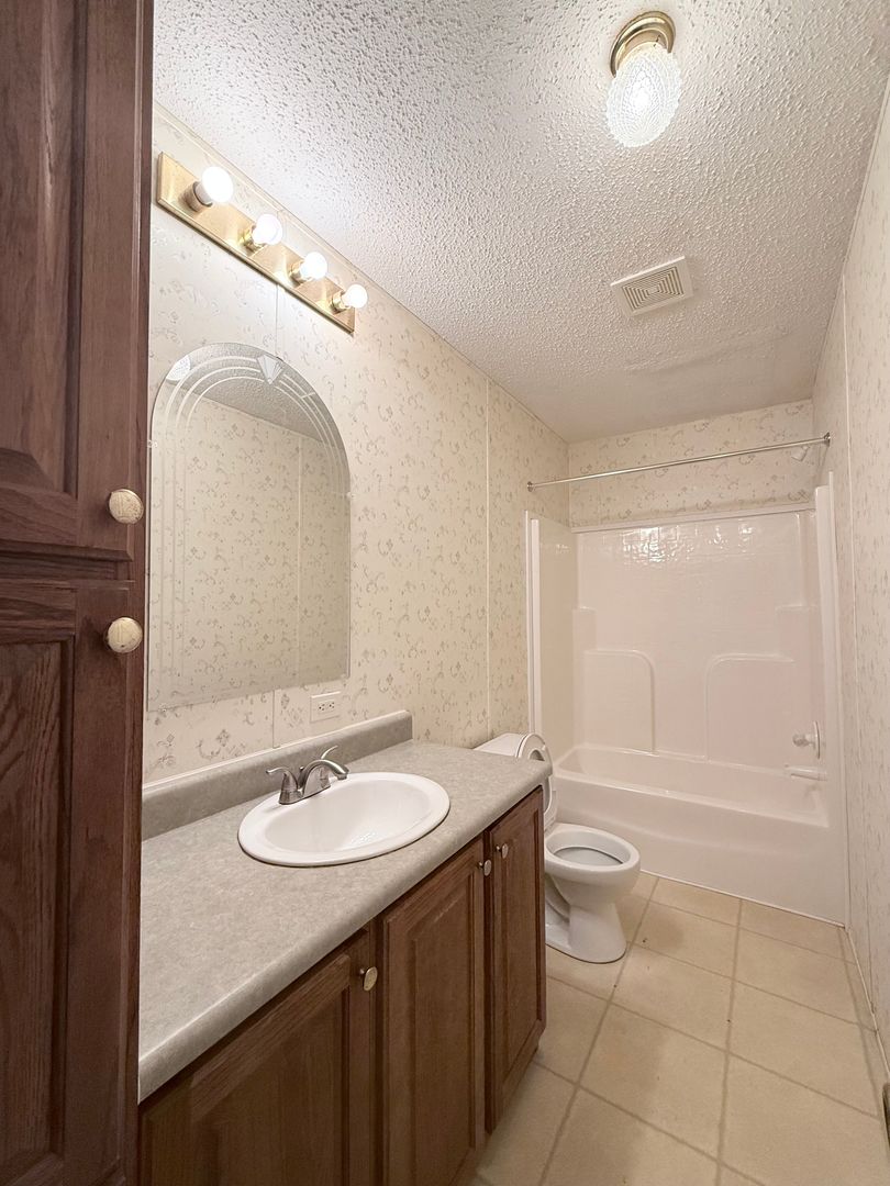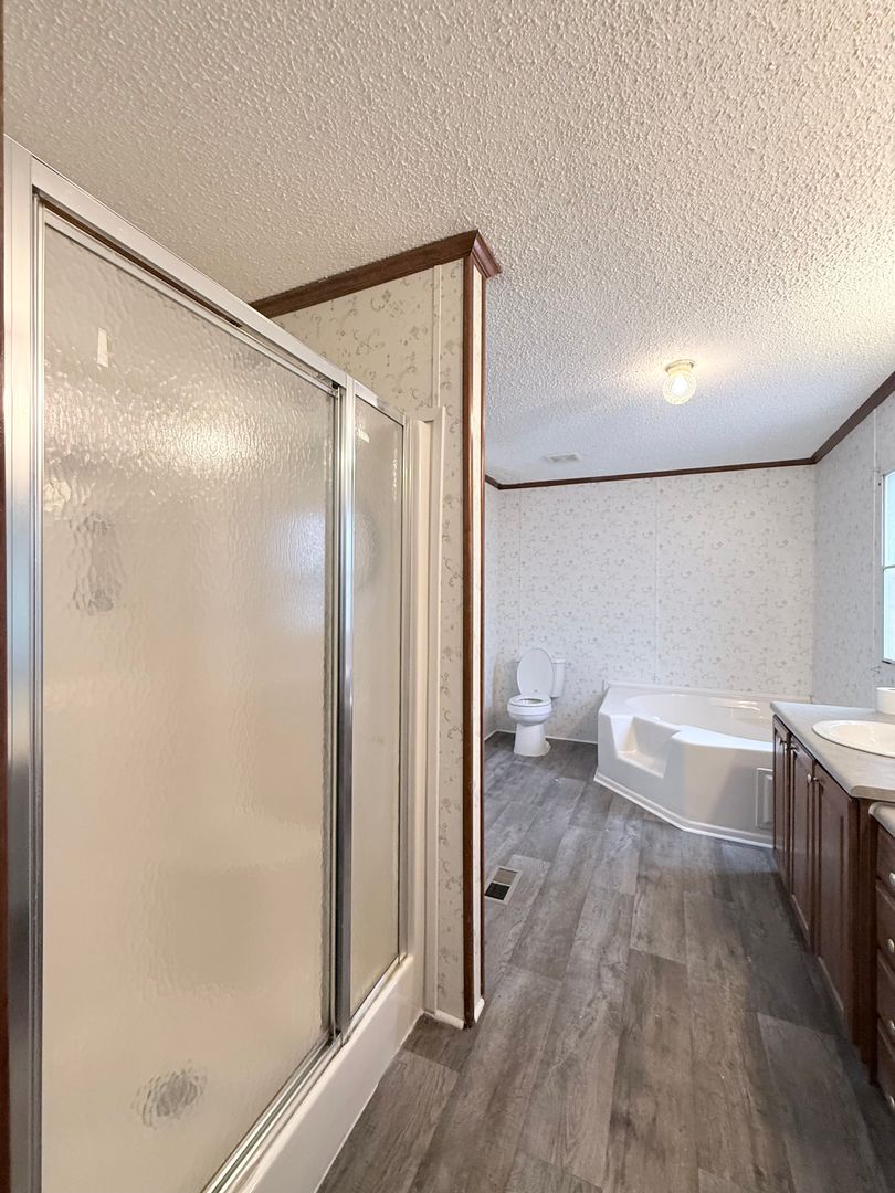This home features an oversized living room with a cozy fireplace, a large kitchen with plenty of cabinet and counter space, and an open layout that makes the home feel even more expansive. The primary suite is generously sized and includes a large ensuite bathroom with a garden tub and separate walk-in shower.